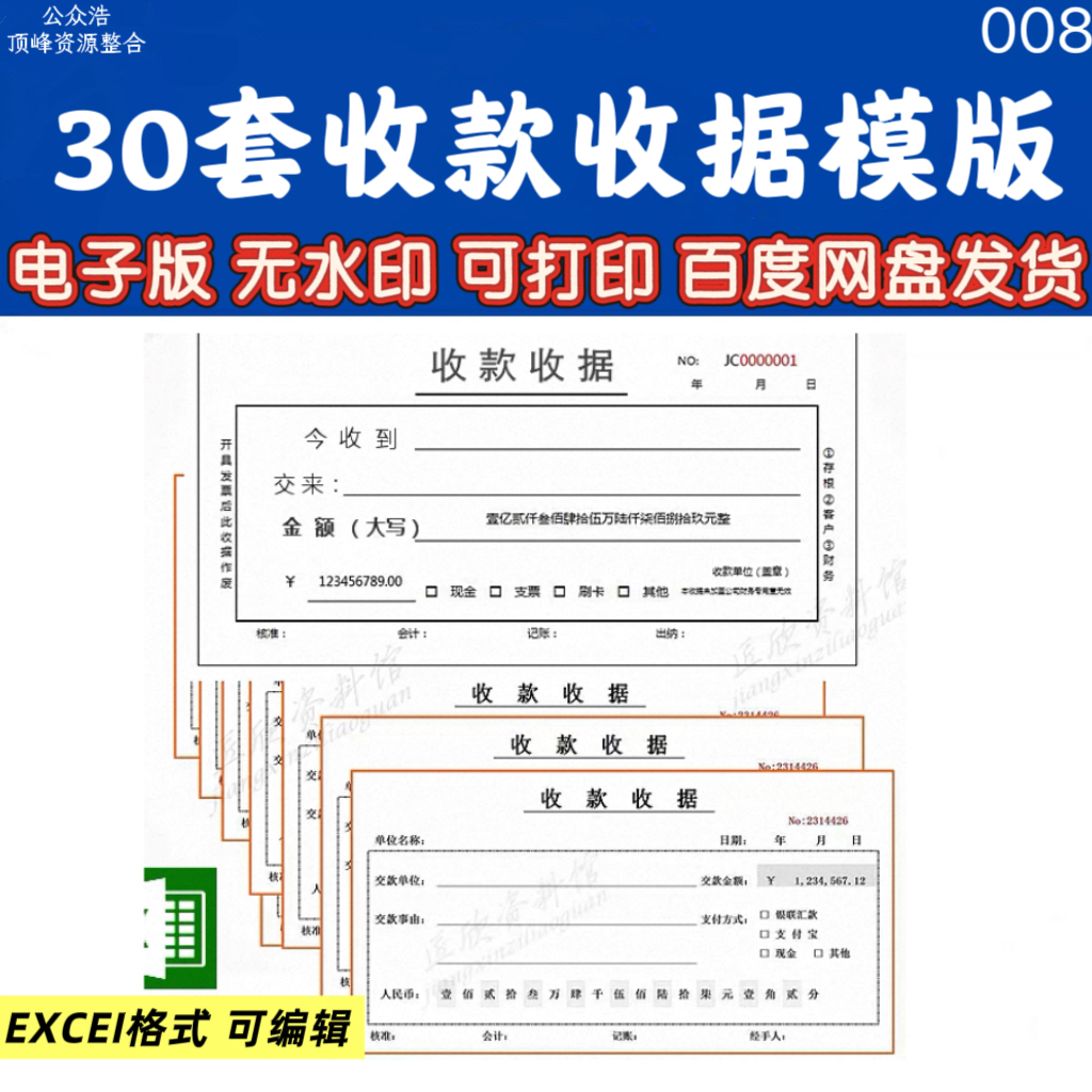 008–收据模板电子版通用收款收据模板excel格式可编辑修改可打印素材-30套