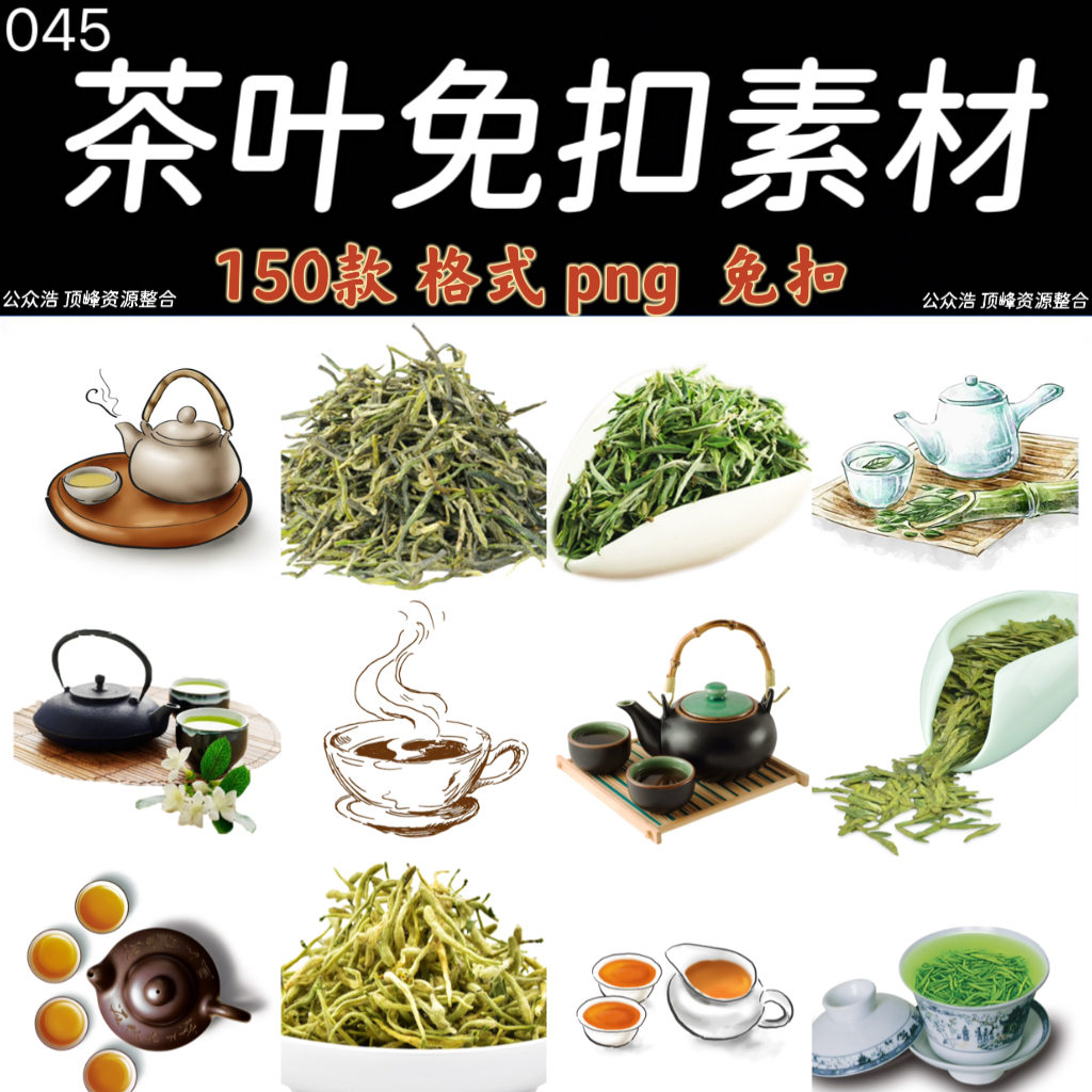 045–茶叶茶具杯子手绘干茶园风光景绿色中国风png免抠背景电商素材