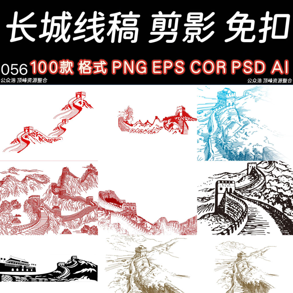 056–psd红色长城墙烽火台剪影黑白线稿剪纸设计矢量png免扣素材元素图