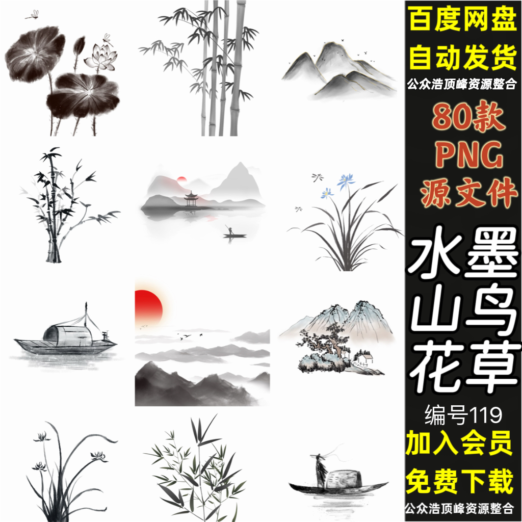 119–水墨中国风山水花草植物建筑梅花竹子荷叶PNG免扣PPT手绘素材图片